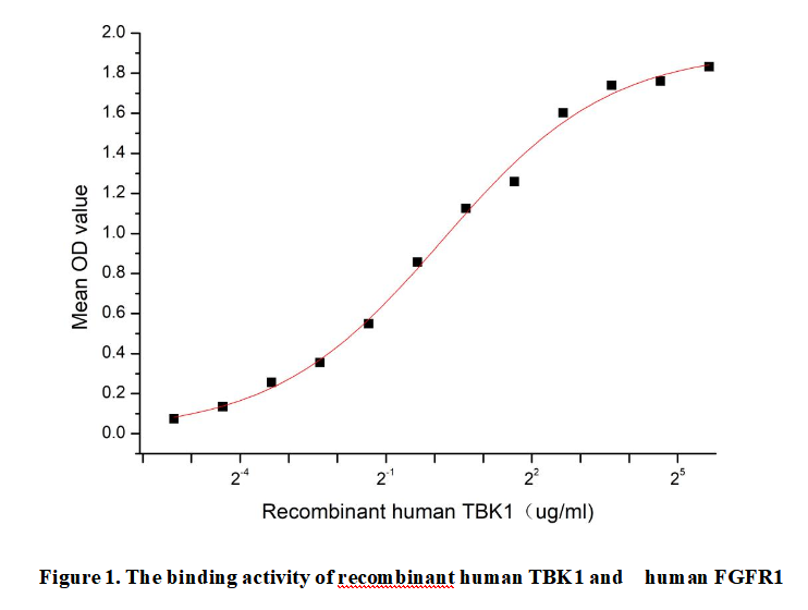 TANK Binding Kinase 1 (TBK1) is a serine/threonine kinase involved in innate immune signaling, particularly in regulating interferon (IFN) production and autophagy. It phosphorylates and activates transcription factors like IRF3/IRF7 to drive antiviral responses. TBK1 also interacts with signaling adaptors (e.g., TANK, TRIF) and is linked to inflammation and neurodegenerative diseases. Dysregulation of TBK1 has been associated with cancer and autoimmune disorders.?Besides,FGFR1 has been identified as an interactor of TBK1, thus a functional binding ELISA assay was conducted to detect the interaction of recombinant human TBK1 and recombinant human FGFR1. Briefly, TBK1 was diluted serially in PBS with 0.01% BSA (pH 7.4). Duplicate samples of 100 μl were then transferred to FGFR1-coated microtiter wells and incubated for 1h at 37℃. Wells were washed with PBST and incubated for 1h with anti-TBK1 pAb, then aspirated and washed 3 times. After incubation with HRP labelled secondary antibody for 1h at 37℃, wells were aspirated and washed 5 times. With the addition of substrate solution, wells were incubated 15-25 minutes at 37℃. Finally, add 50 μL stop solution to the wells and read at 450/630nm immediately. The binding activity of recombinant human TBK1 and recombinant human FGFR1 was shown in Figure 1, the EC50?for this effect is 1.11 μg/mL.